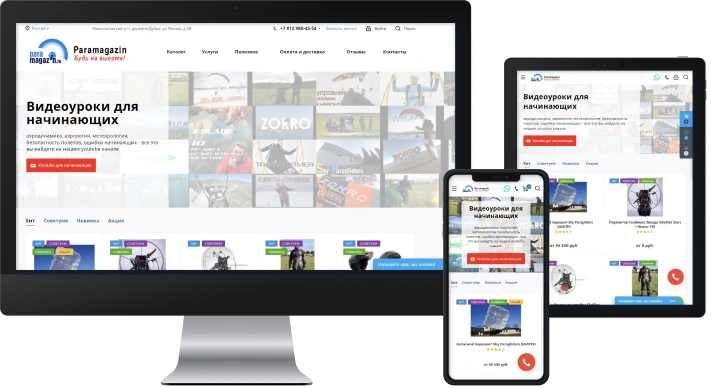 Paramagazin - спортивный интернет-магазин по продаже парапланов, парамоторов и парапланерного оборудования, аксессуаров и одежды для парапланеристов. Организовали переезд сайта на Битрикс с Мегагрупп. Запустили проект на готовом решении Аспро: Next. Перенесли товар импортом экспортом, подключили обновление цен по курсу валют. Полностью сменили устаревший дизайн. Настроили мультирегиональность и добавили 20 регионов. Проанализировали сайты конкурентов и разработали удобную и логичную структуру каталога товаров. Выполнили внутреннюю оптимизацию сайта. Настройка обновления цен и остатков от поставщиков. Запустили рекламную кампанию в Яндекс.Директ. Результат проделанных работ - стремительный рост видимости сайта, увеличение количества посетителей, рост заявок с сайта.